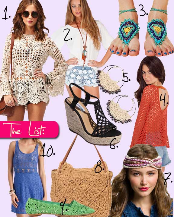 Crochet and macrame fabrics are perfect hot and humid days, not too mention they can make anyone look hippie chic! I’ve found that the best way to wear these looks is by wearing one crochet element into your look, otherwise it’s a little overkill. There’s tons of crocheted merchandise out there from your shoes, to your turban or coverup this is a very easy trend to incorporate into your summer wardrobe. You can even get crafty and crochet something yourself with one of the many how-to books out there. Above are my favorite crochet options. What are yours? Have you tried out this trend yet?