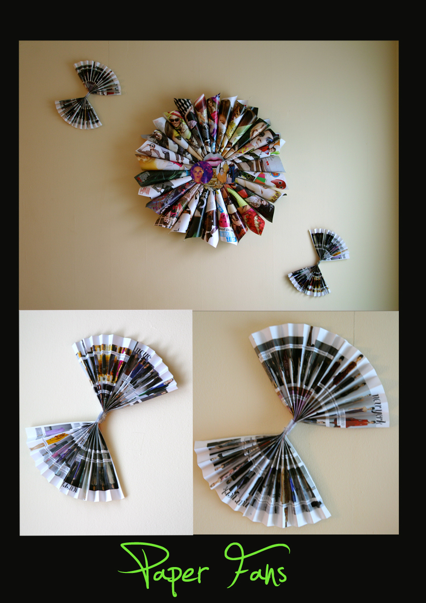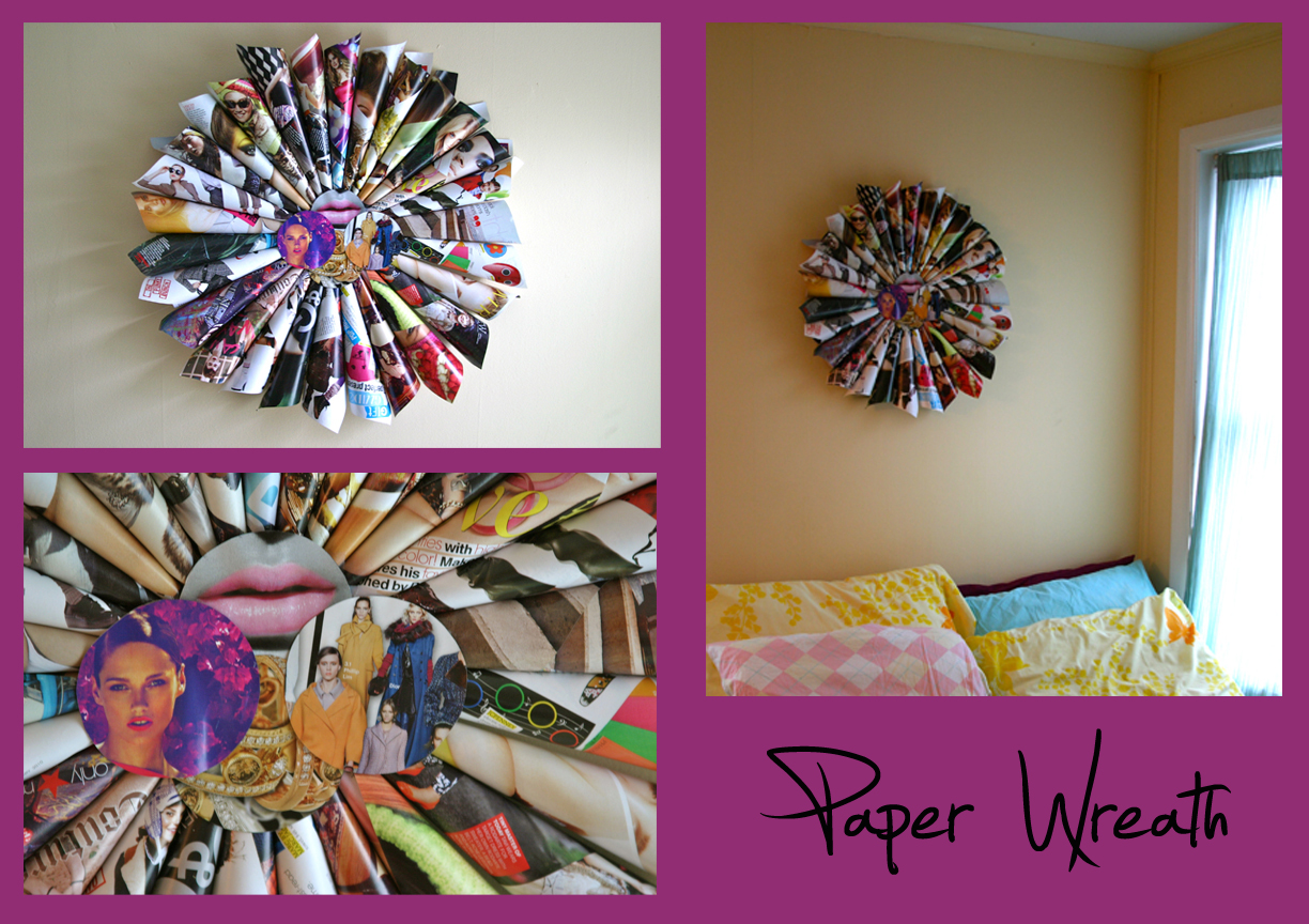 I’ve started a little bit of spring cleaning this month and I came to the conclusion that I’m a hoarder…of magazines. I probably had about 20 lbs worth of paper publications and at first, had no idea what to do with them. The solution? Paper Wall Art! Now, I’m not talking about plastering my wall from floor to ceiling in ripped out magazine pages like I did in middle school, (although some of those collages were pretty epic) but I was pretty pleased with my end result of collages and paper wreath and fans. See for yourself below!