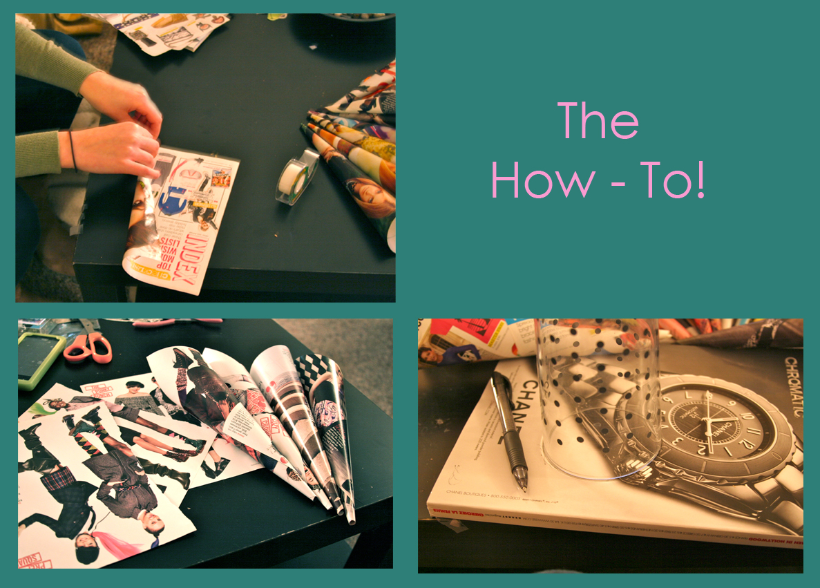 Making these paper crafts is really simple! For the wreath, simply tear out your favorite magazine pages (I used about 28, but you can use less) and you’ll roll them into cone shapes. Place the page horizontally in front of you with the torn edge closest to you. Being rolling the paper from either the right or left corner until it is shaped like a cone and tape it in place. Once you’ve finished making all of your cones, take a glass or bowl to create a perfect circles for the center–you’ll need one for the front and the back. Use a more structured piece of paper (I used the front and back covers of the magazine). Finally, place all of your cones in a circle and tape the center circles to the center of the cones. For added support you can tape or glue the cones together before taping on the center circle.