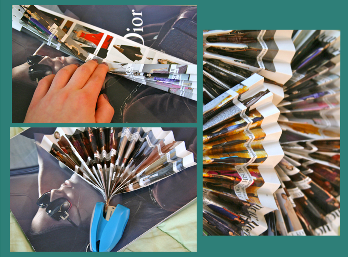 For the fans, you’ll start the same way as the wreath with a magazine page, torn edge closest to you. Then, fold the paper back and forth to create the accordion fold. Next, fold it in half and staple the middle to keep in place. Finally, take to fans and connect the middles of each with tape to create the bow shape.