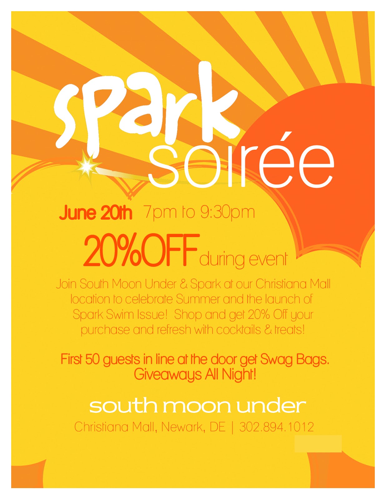 Hey guys! If you’re in the local New Castle County or surrounding areas. South Moon Under at the Christiana mall is having a fabulous party tomorrow, June 20th from 7-9:30pm. There will be plenty of treats, giveaways and sales going on so this is not an event to miss! I went to their grand opening party last fall and it was a lot of fun; SMU really knows how to throw a party! So grab some shopping buds and get there early because the first 50 guests in line get free swag bags! Happy shopping 🙂