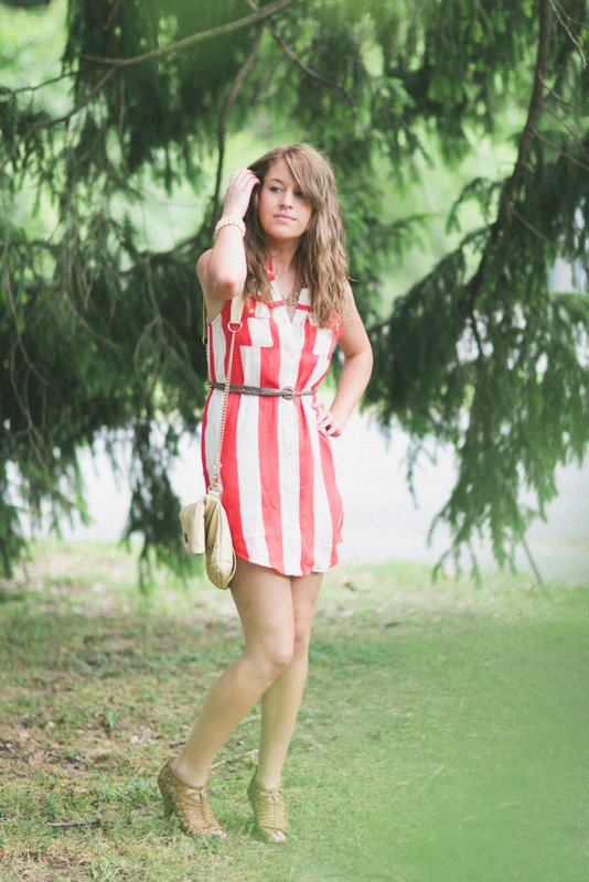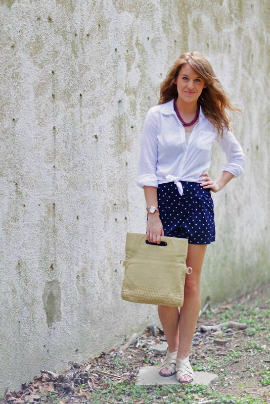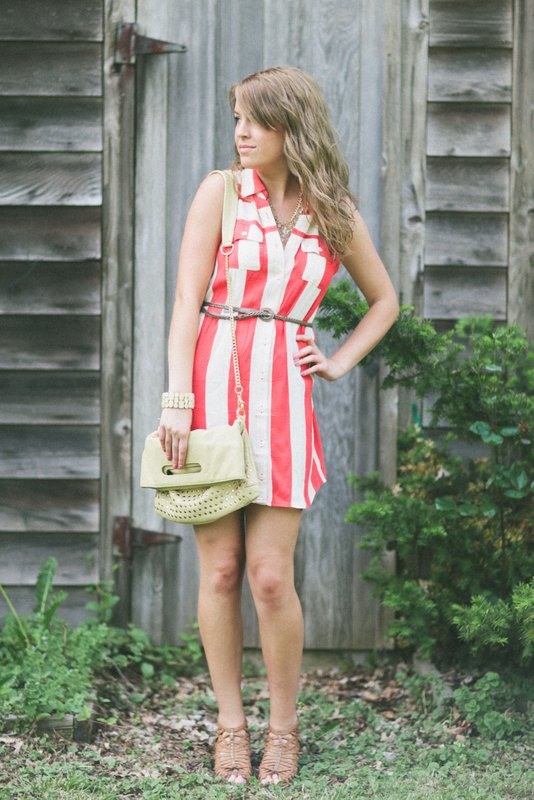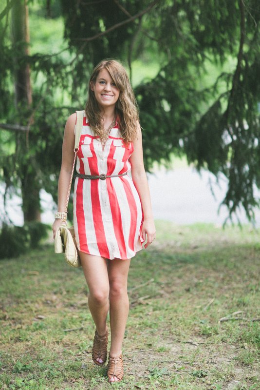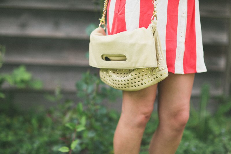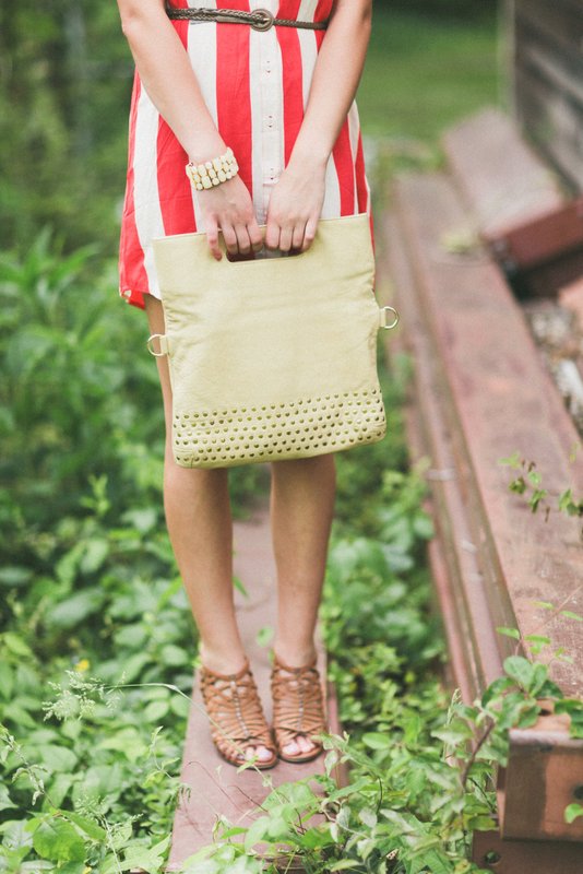 sheer button down with high waisted, polka dot shorts (that I got on super sale at Urban Outfitters) and Lucky Brand sandals. The latter is a bold striped dress from Forever21 with a thrifted belt and heeled sandals. The Makayla looked perfect with both! I’ll be sad to see this beautiful bag go, but can’t wait to see what the next blogger’s outfit looks like! Check out Sienna Ray for even more pretty bags HERE!