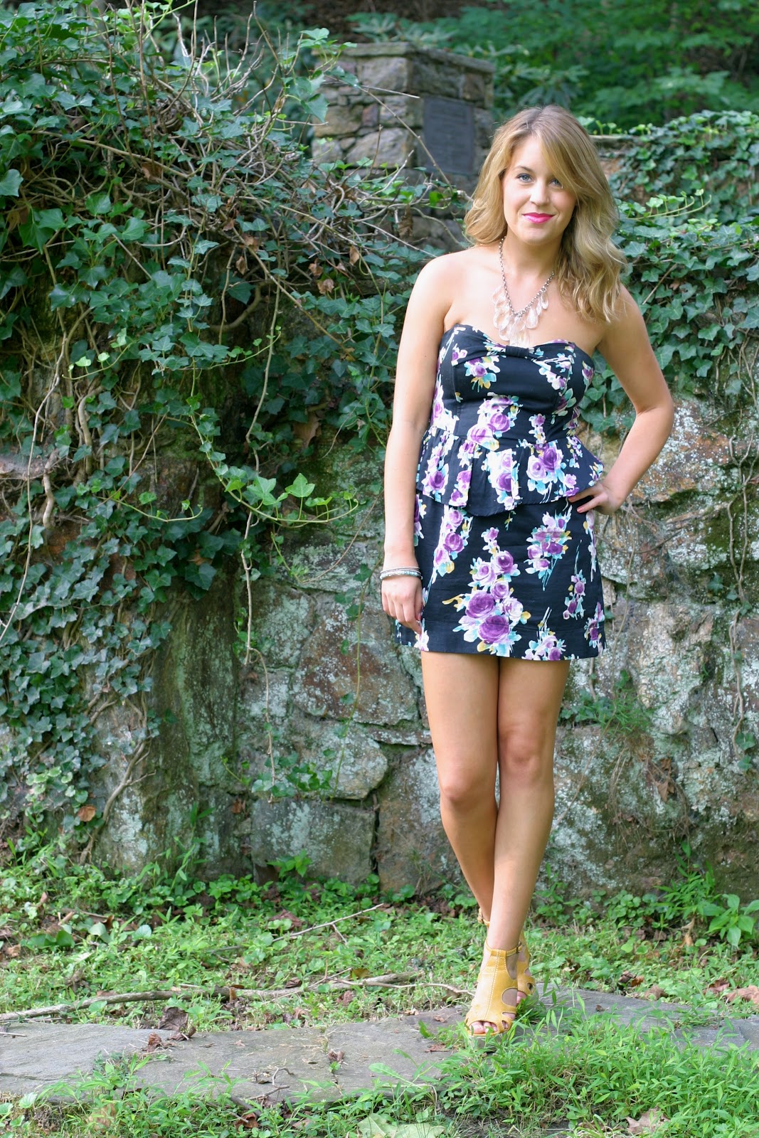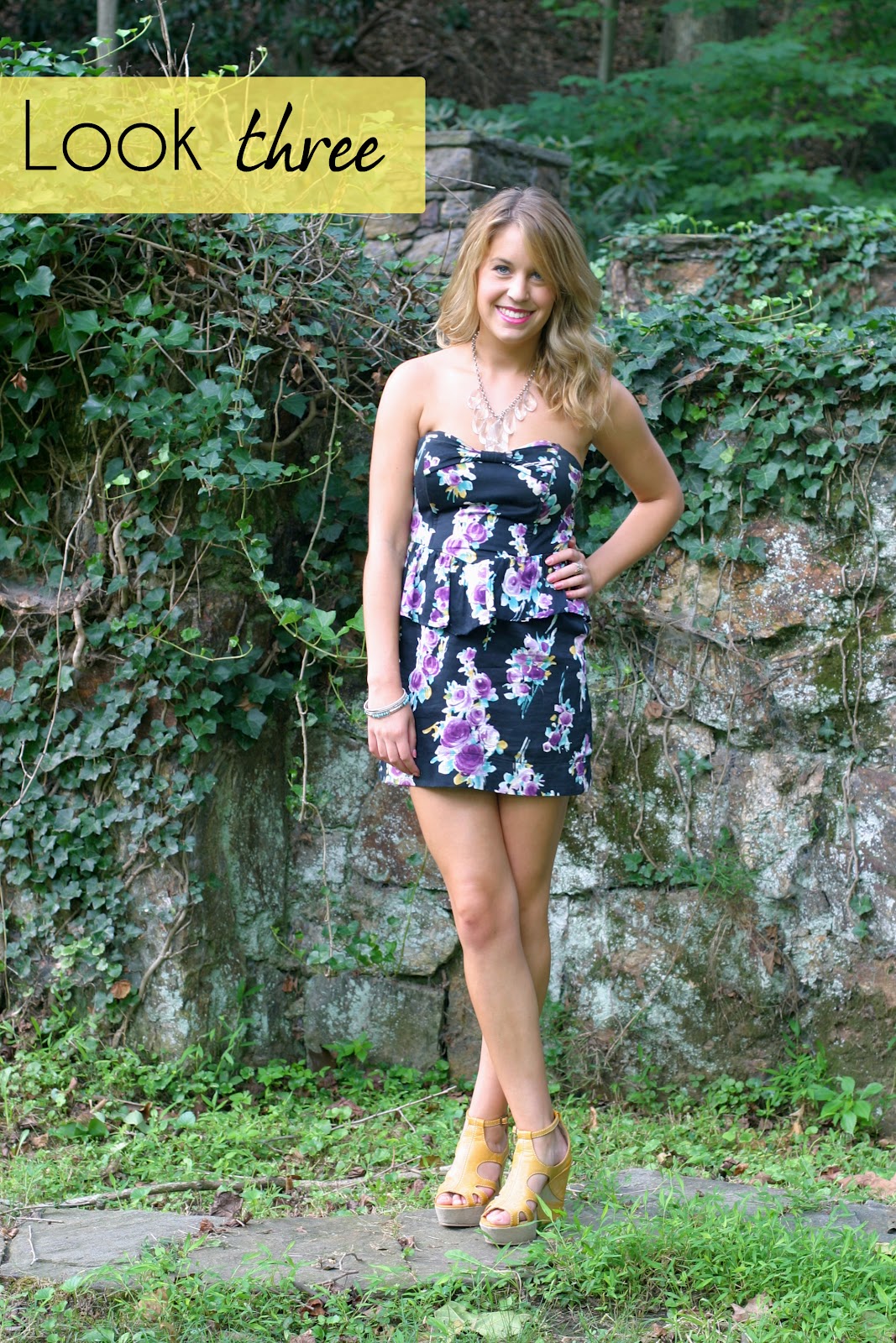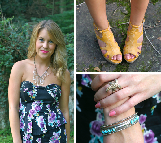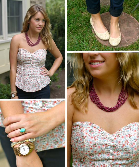 Look two is a bit more casual. I’d wear this out for a Sunday shopping adventure or a BBQ. I love the peplum bustier top because it adds girly structure to an outfit that would typically be a lot more simple and less exciting. I threw on a semi-bold necklace to play up the sweetheart neckline, too!