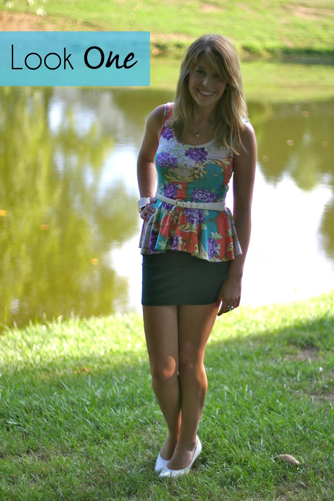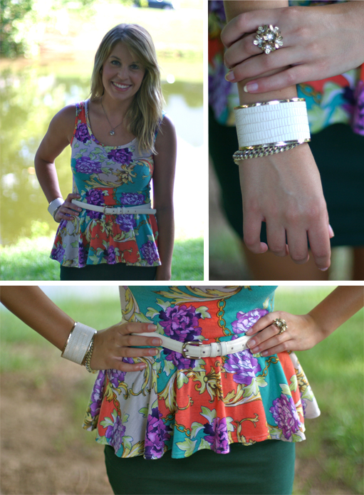 My first look is something I would definitely wear to work if I wasn’t funemployed or out for happy hour/dinner. The ensemble consists of my scarf print peplum top and a fitted pencils skirt and kitten heels. I belted my top to give my waist a little more shape and draw attention to the peplum aspect. Hint: Peplum tops like this go great with bottoms that are more fitted, not flowing. It’s all about proportion, people.